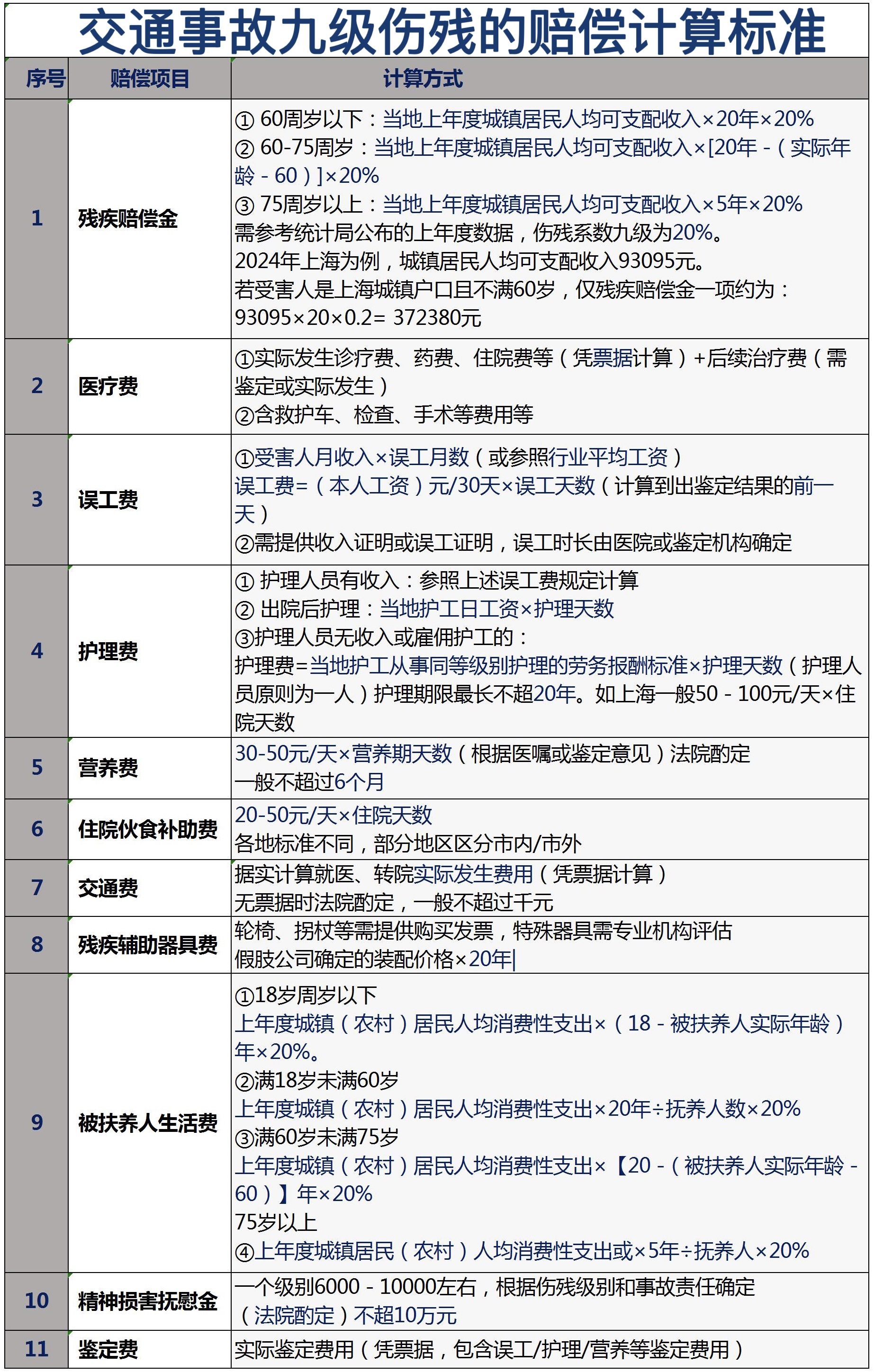 1. 残疾赔偿金:按受诉法院所在地上一年度城镇居民人均可支配收入标准计算。2024年度上海城镇居民人均可支配收入为93,095元。