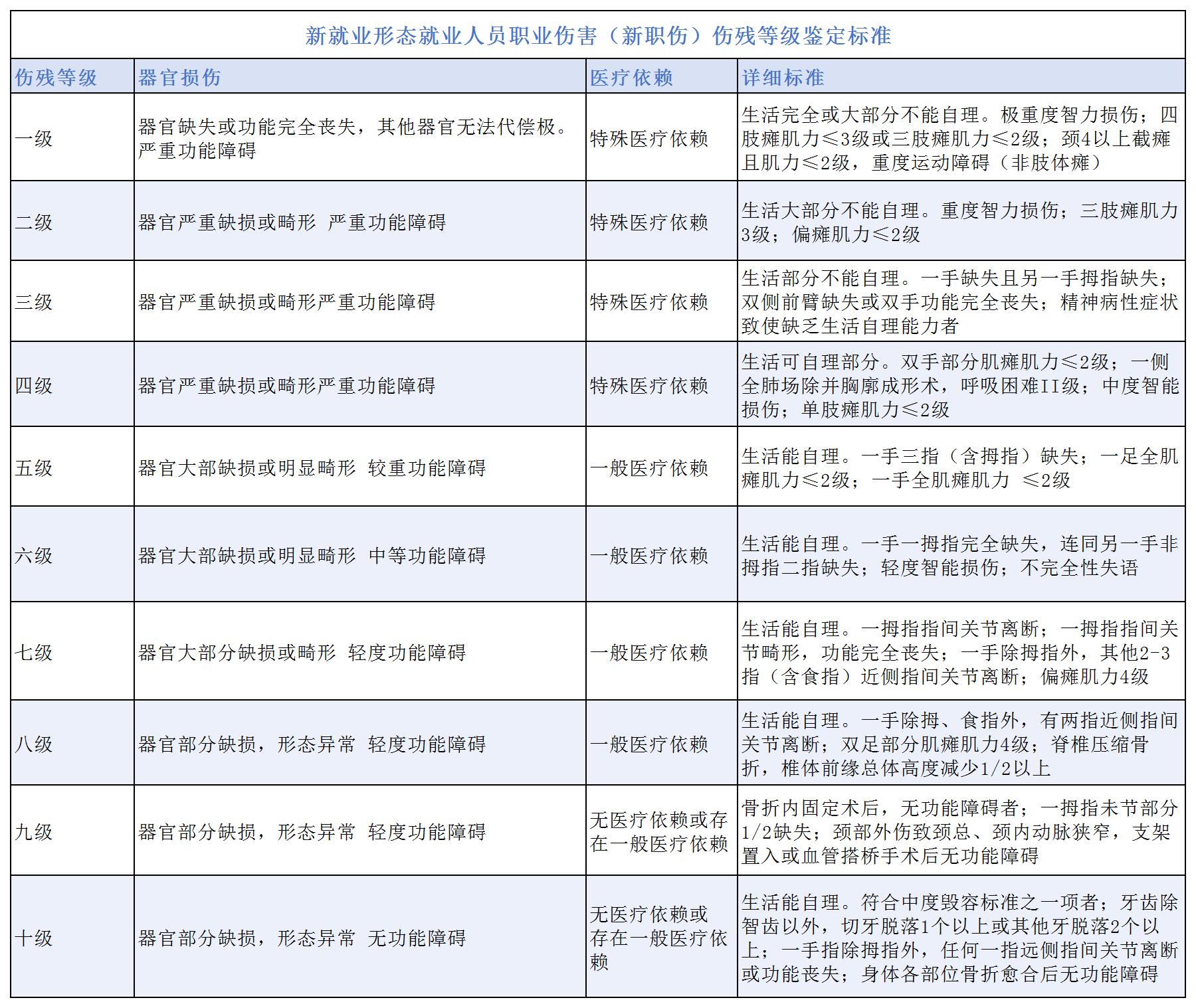 新职伤伤残认定主要依据《劳动能力鉴定 职工工伤与职业病致残等级(GB/T 16180 - 2014 ),与工伤伤残认定标准一致,从器官损伤、功能障碍、医疗依赖及生活自理障碍等多方面综合评定,划分为十个等级。