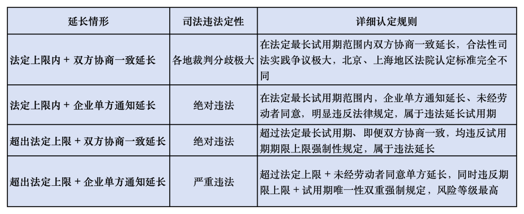不得以任何理由延长试用期,包括双方协商一致的形式;北京全域完全违法,上海存在极高败诉风险,不延长是唯一零风险选择。