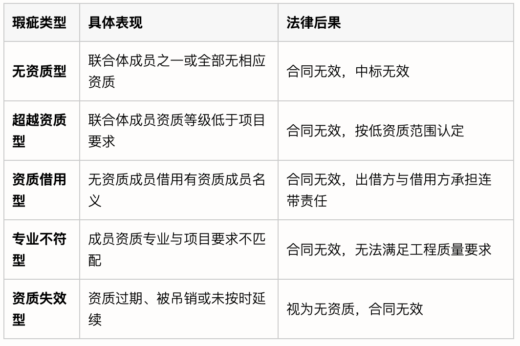 成员资质证书过期、被吊销,或处于暂扣期/整改期;项目经理、技术负责人等核心人员无相应执业资格,或存在在建项目冲突、社保不匹配等问题,也会被认定为资质瑕疵,影响合同效力。