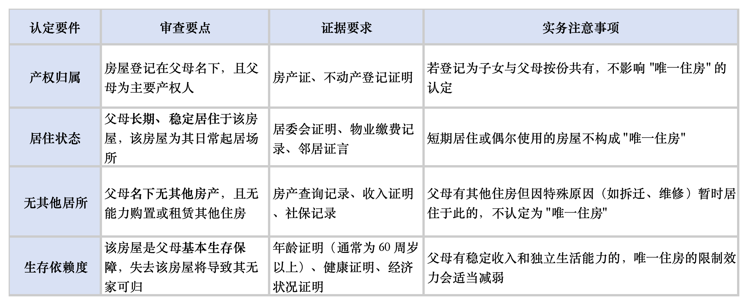 法院认定 "唯一住房" 通常需审查以下要件,这是适用生存权优先原则的前提: