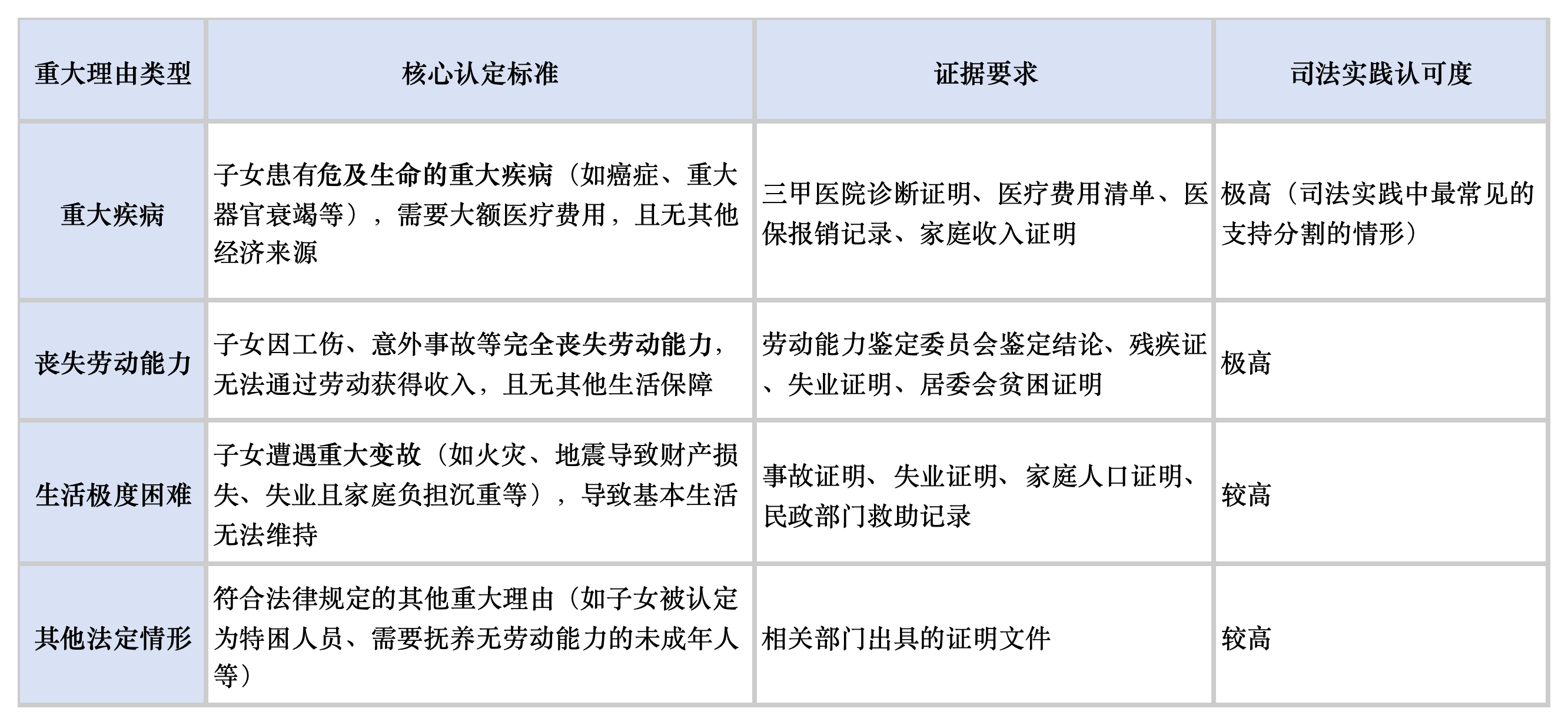 强调 "重大理由"(如重大疾病、丧失劳动能力),避免非必要需求表述补偿。