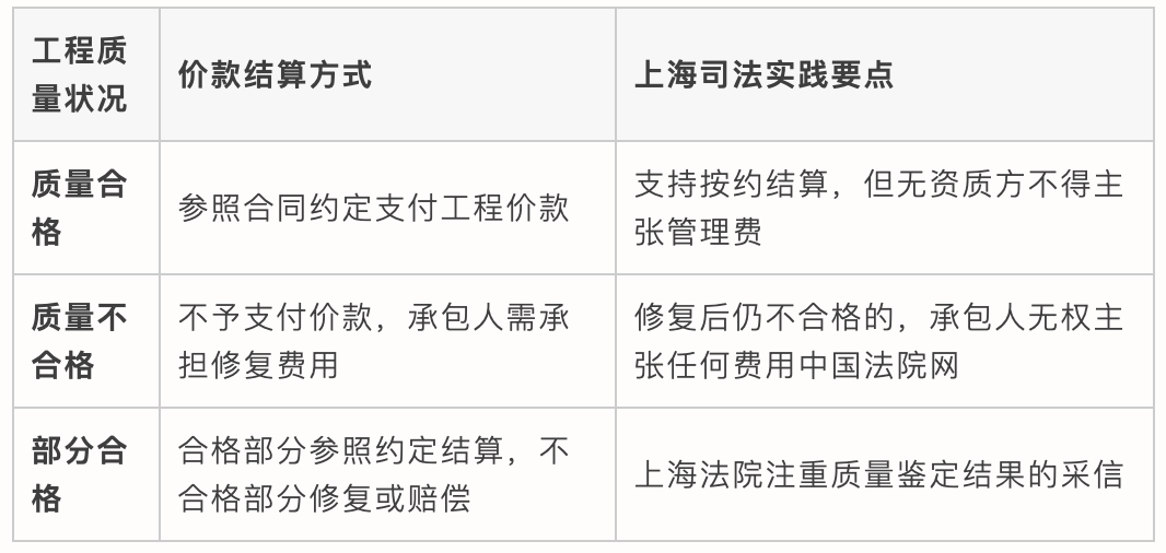 工程质量合格是承包人获得价款的必要前提,与合同效力无关。上海二中院判例:即使合同无效,只要工程质量合格,承包人仍有权主张参照合同约定结算价款。