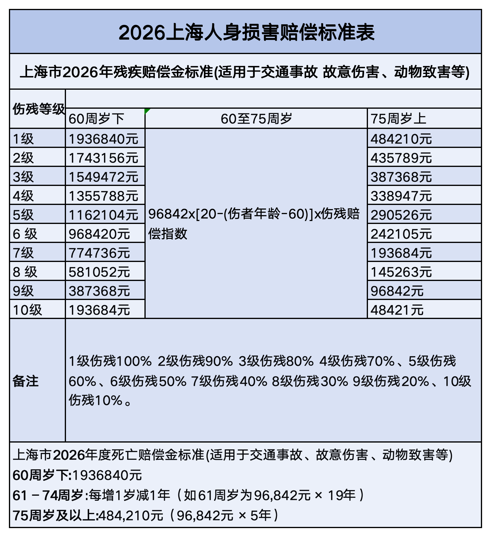 上海市统计局已公布2025年度上海市居民收入及支出相关数据,根据《上海市高级人民法院关于进一步推进人身损害赔偿标准城乡统一试点工作的意见》规定,即日起,上海地区人身损害赔偿案件中残疾赔偿金、死亡赔偿金均按照新标准96842/年进行计算,死亡赔偿金标准调整为1936840元(96842 *20),