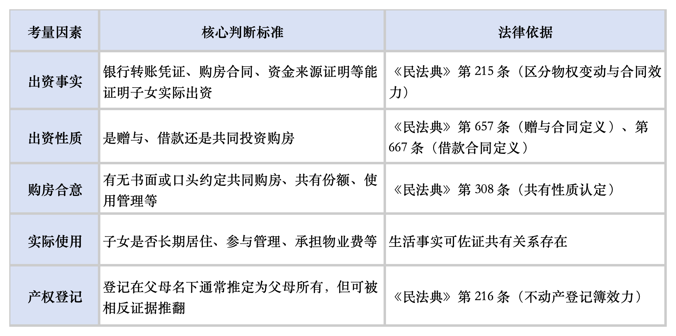实务要点:子女主张共有需承担举证责任,证明 "共同出资 + 共同购房合意" 双重要件,否则可能被认定为赠与或借款关系。