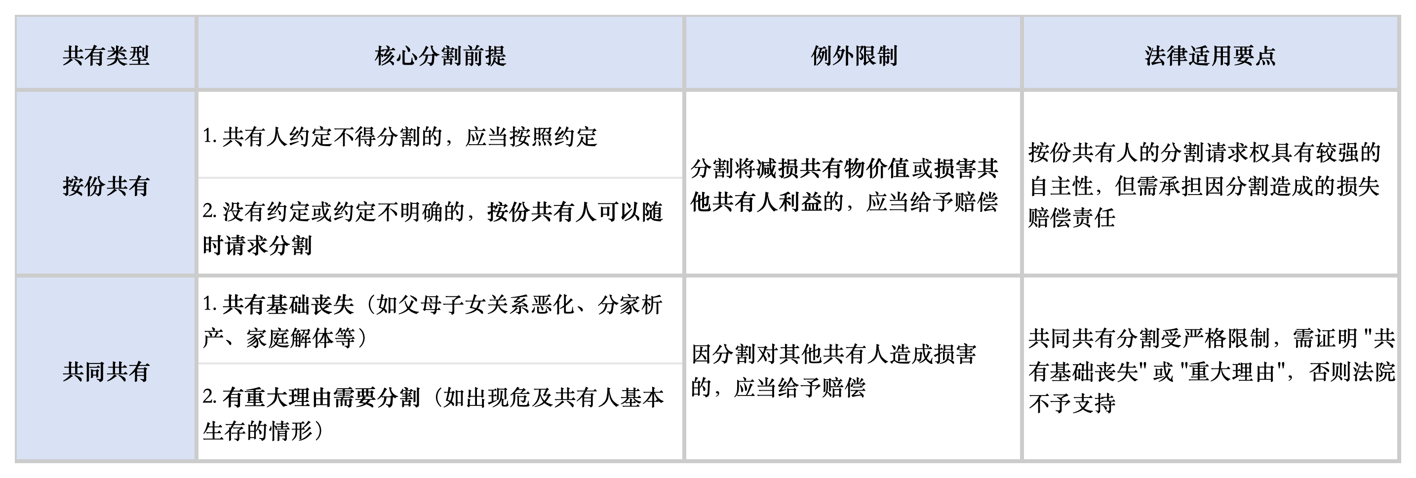 根据《民法典》第 303 条,共有物分割的法定前提因共有类型不同而存在显著差异,这是处理此类纠纷的基础法律依据: